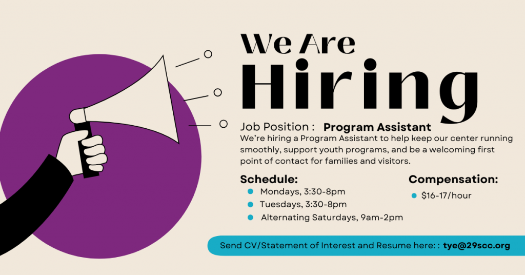 We’re hiring a part-time Program Assistant to help keep our Center running smoothly, support youth programs, and be a welcoming first point-of-contact for families and visitors. Send your statement of interest and resume to tye@29scc.org.